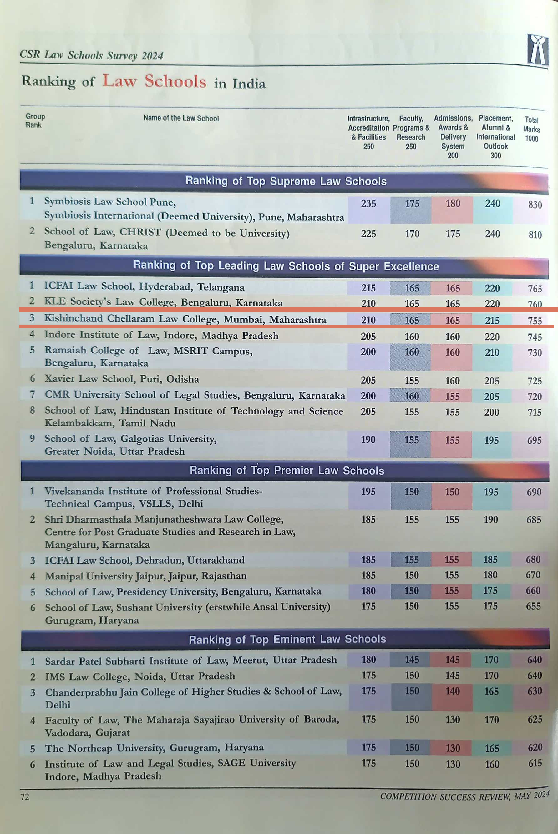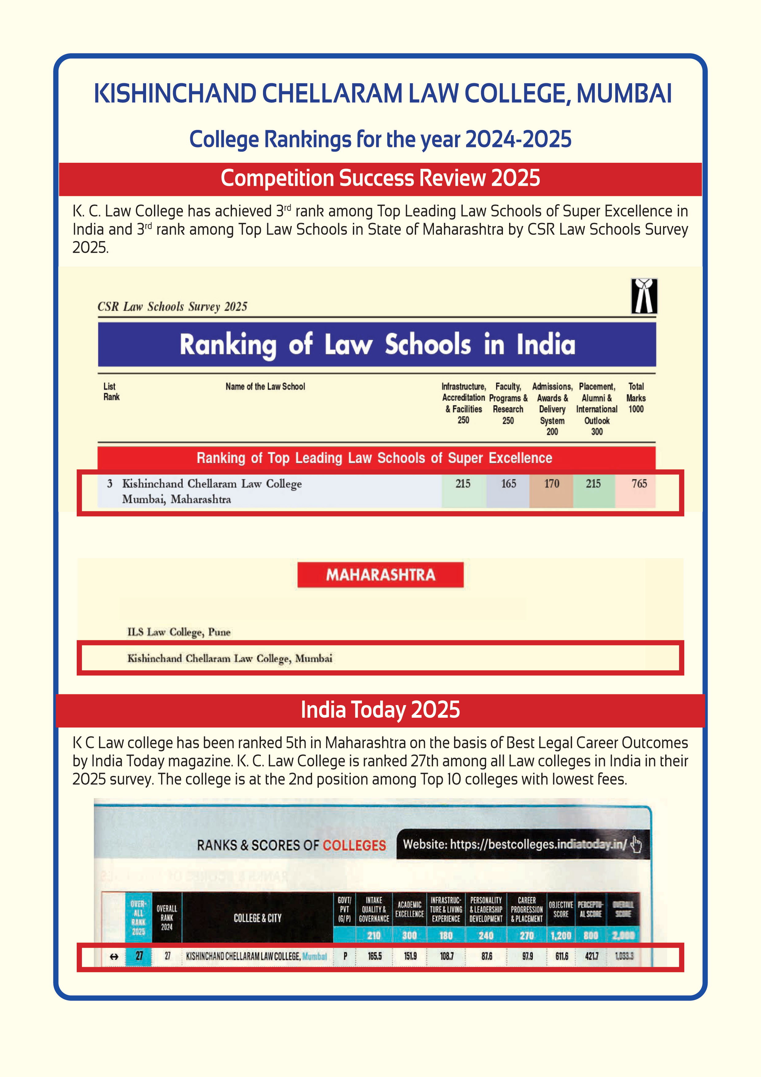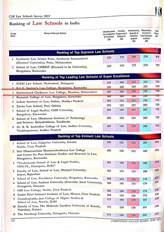 K C Law College is the only Law College from Mumbai to be ranked 3rd at national level amongst 'Top Leading Law Schools of Super Excellence in India' and is also ranked 2nd in the 'State of Maharashtra'.