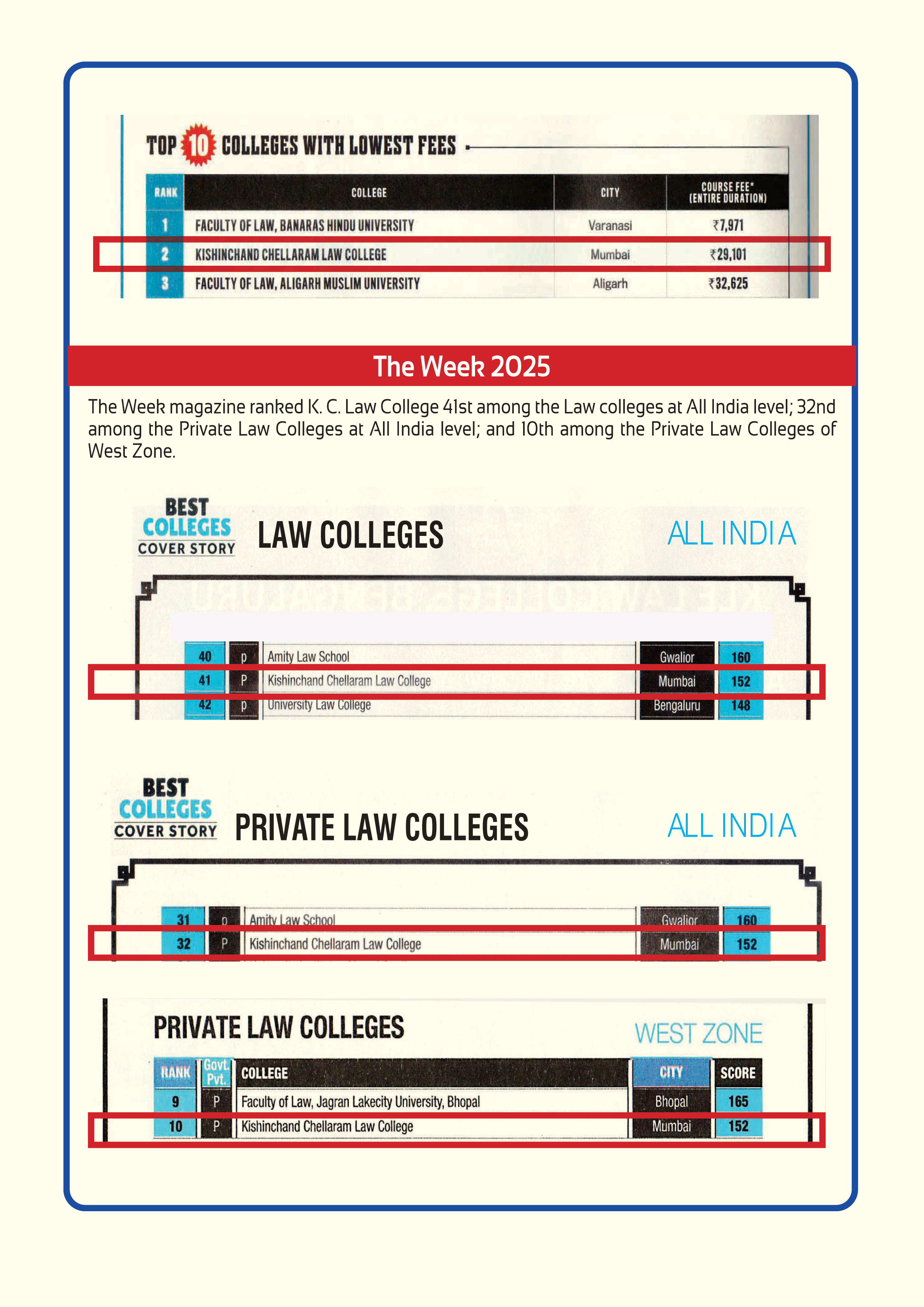 K. C. Law College is ranked 28th among Best Law Colleges – All India; 19th among BestPrivate Law Colleges – All India; and 5th among Best Private Law Colleges of West Zone.