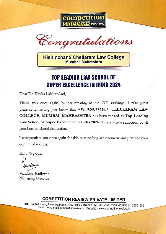K C Law College is the only Law College from Mumbai to be ranked 4th at national level amongst 'Top Leading Law Schools of Super Excellence in India' and is also ranked 3rd in the ‘State of Maharashtra’